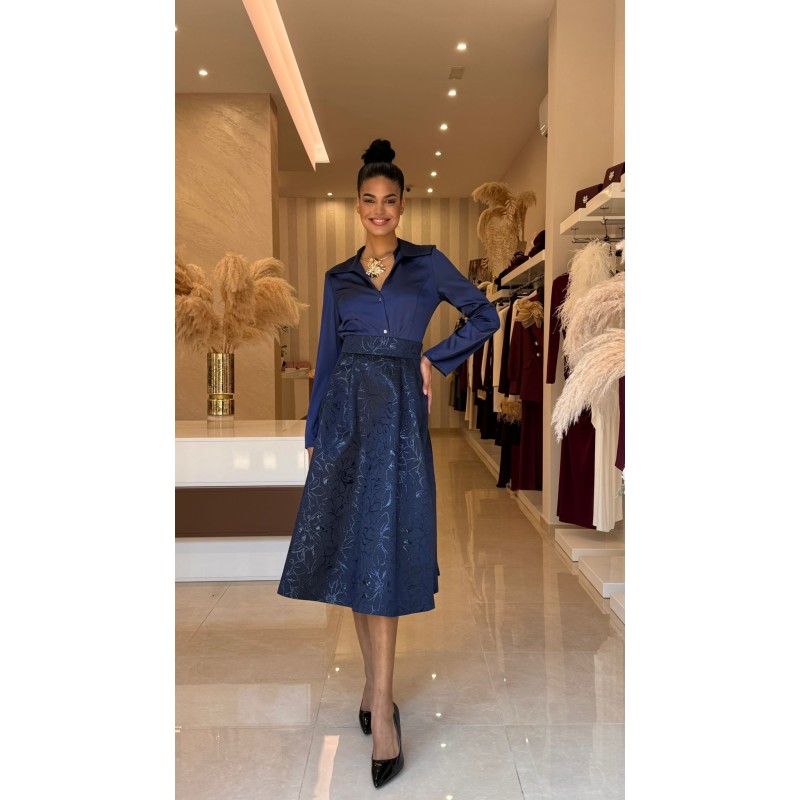 Blusa effetto seta con gonna midi decorata, la vestibilità è regolare e la modella indossa la S