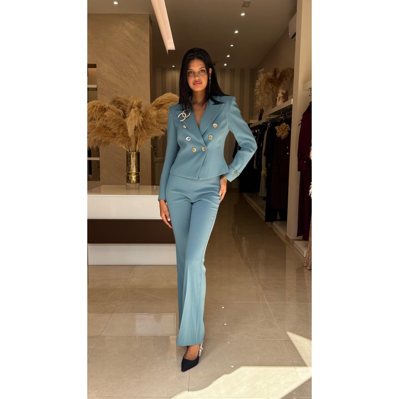 Nuovo Aggiungi al carrello Anteprima home Tailleur grigio Tailleur grigio gessato con piume applicate.