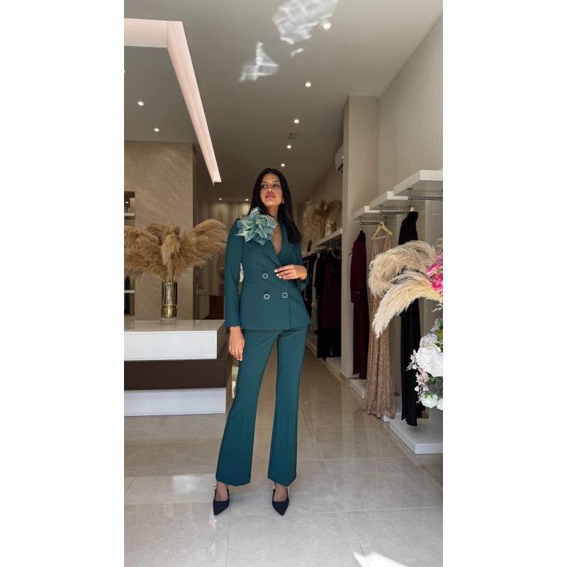 Tailleur con giacca aderente e pantalone a zampa, la vestibilità è regolare e la modella indossa la taglia 40